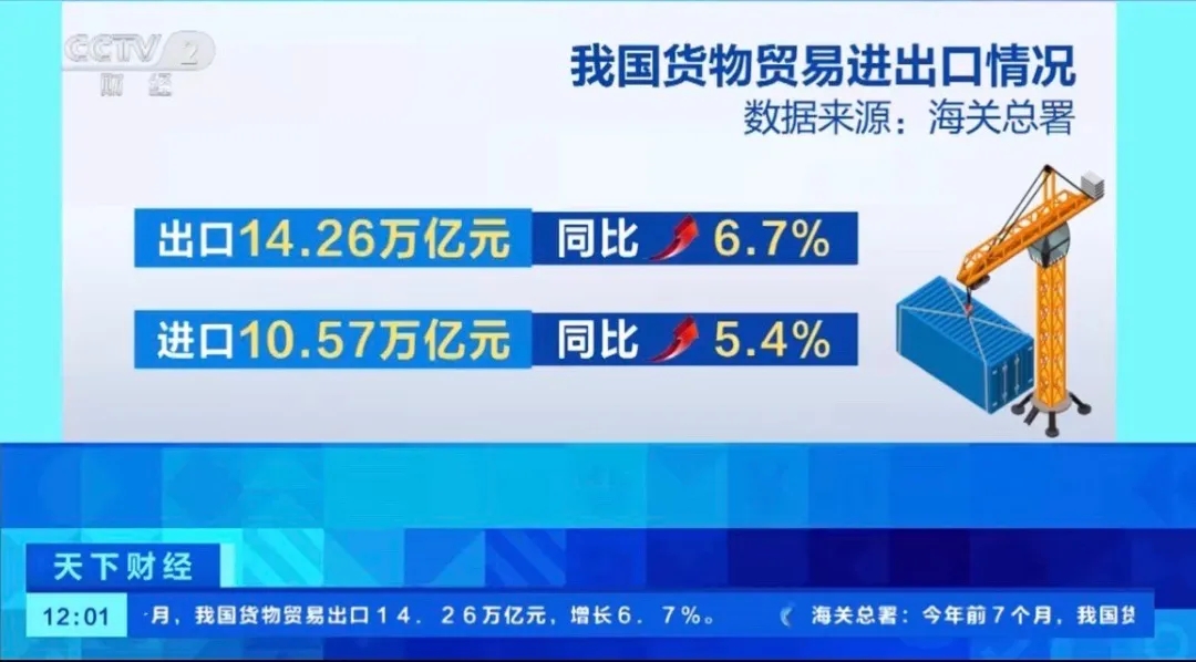 据海关统计,今年前7个月,我国货物贸易进出口总值24.83万亿元,同比增长6.2%。其中,出口14.26万亿元,增长6.7%;进口10.57万亿元,增长5.4%。