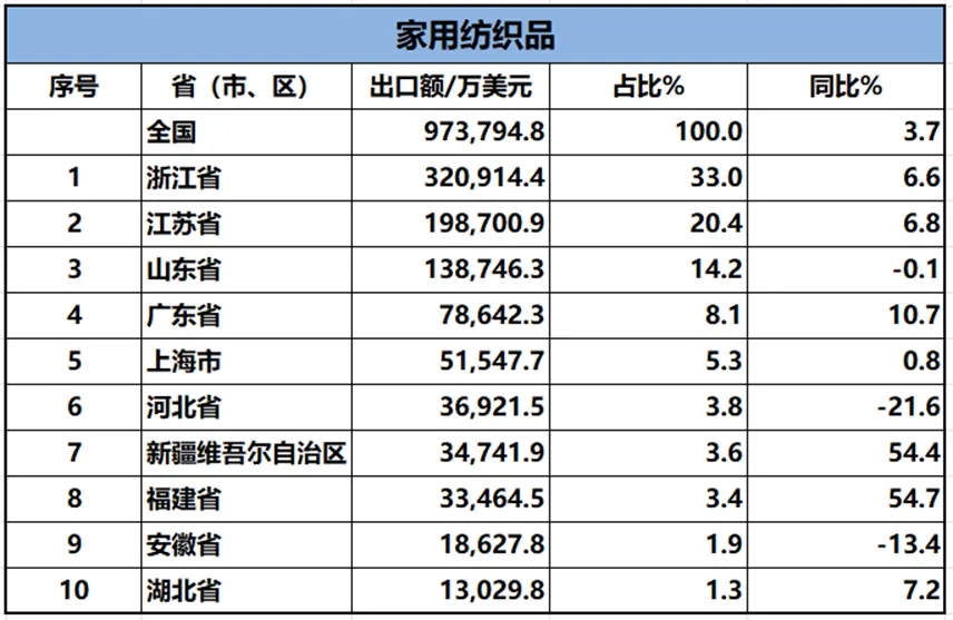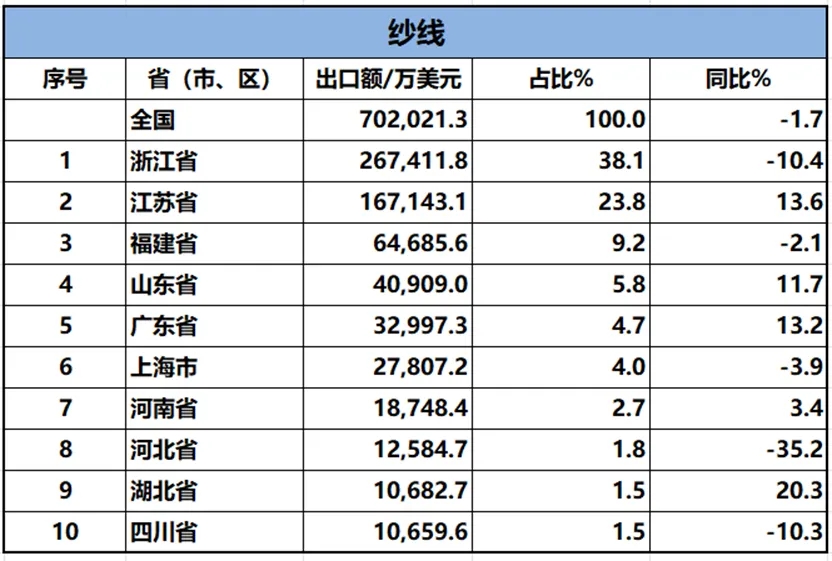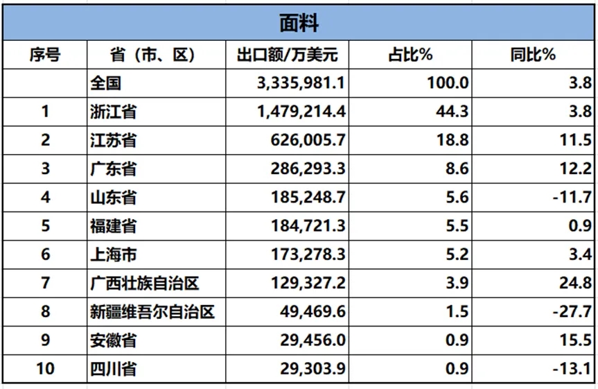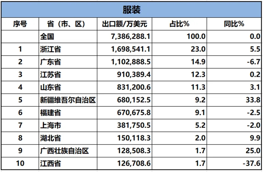 2024年1-6月,我国纺织服装累计出口1432.38亿美元,同比增长1.6%。内地31个省、自治区、直辖市纺织服装统计数据已出炉,浙江省、江苏省、广东省、山东省、福建省分别列全国纺织服装出口省市前五位,合计比重超七成。